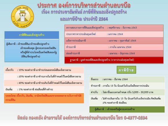 หัวข้อ :: ประชาสัมพันธ์ภาษีที่ดินและสิ่งปลูกสร้าง ภาษีป้าย ประจำปี 2564