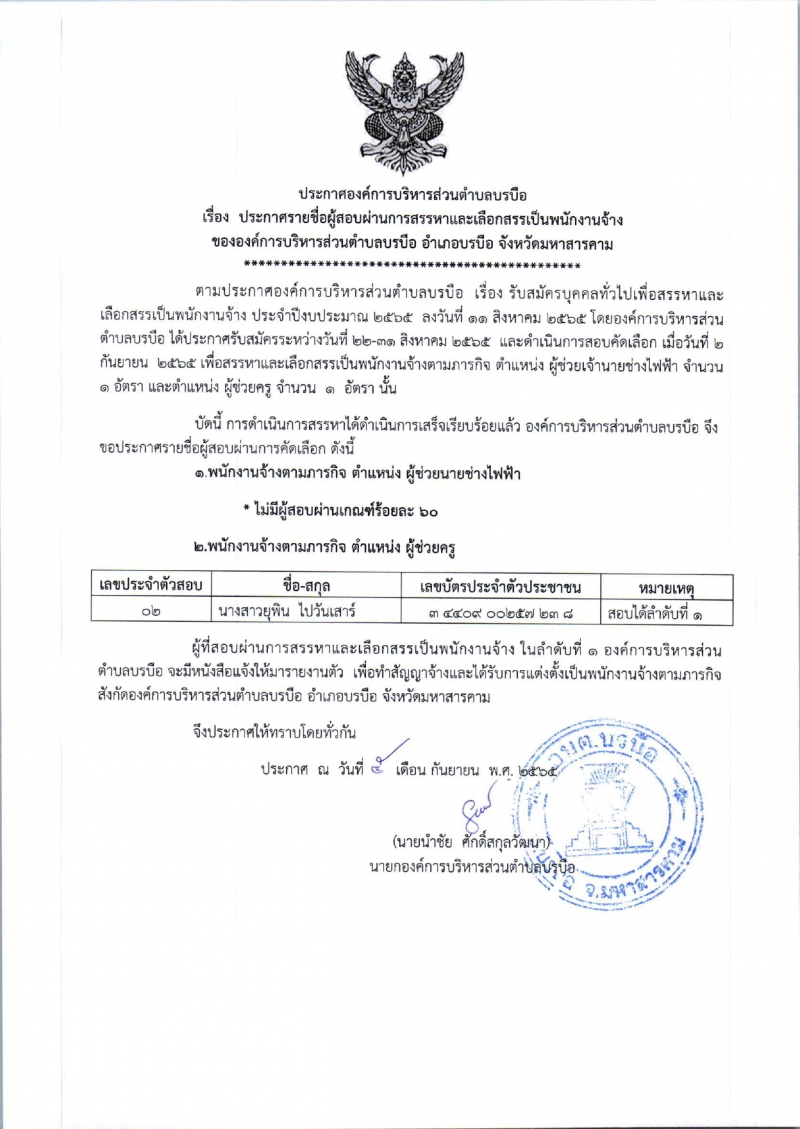 ประกาศรายชื่อผู้สอบผ่านการสรรหาและเลือกสรรเป็นพนักงานจ้าง