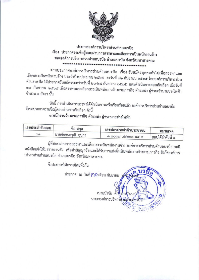 หัวข้อ :: ประกาศรายชื่อผู้สอบผ่านการสรรหาและเลือกสรรเป็นพนักงานจ้าง อบต.บรบือ