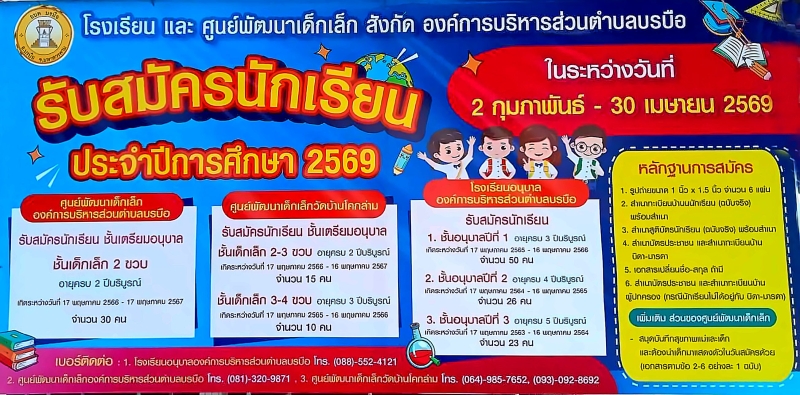 โรงเรียนอนุบาลและศูนย์พัฒนาเด็กเล็ก สังกัดองค์การบริหารส่วนตำบลบรบือ เปิดรับสมัครนักเรียน ประจำปีการศึกษา 2569 ในระหว่างวันที่ 2 กุมภาพันธ์ถึง 30 เมษายน 2569